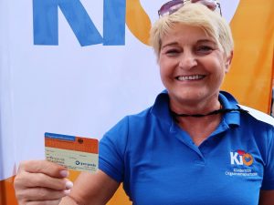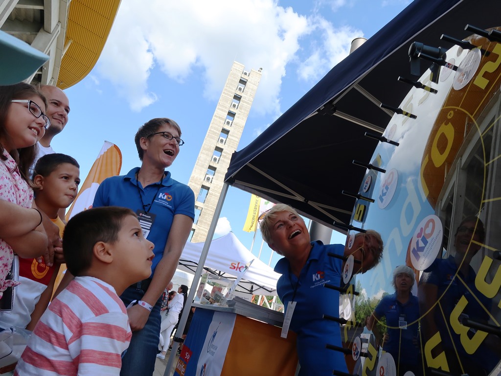 Berichterstattung über die Aktivitäten der Kinderhilfe Organtransplantation bei der Saisoneröffnungsfeier von Eintracht Frankfurt. Die Sportler für Organspende Franziska Liebhardt (lungen- und nierentransplantierte Leichtathletik-Paralympicssiegerin) und Petra Wahnsiedler (nierentransplantierte Judo-EM-Zweite) verteilten dabei fleißig Organspendeausweise.